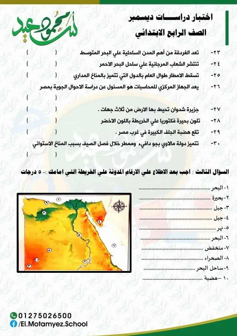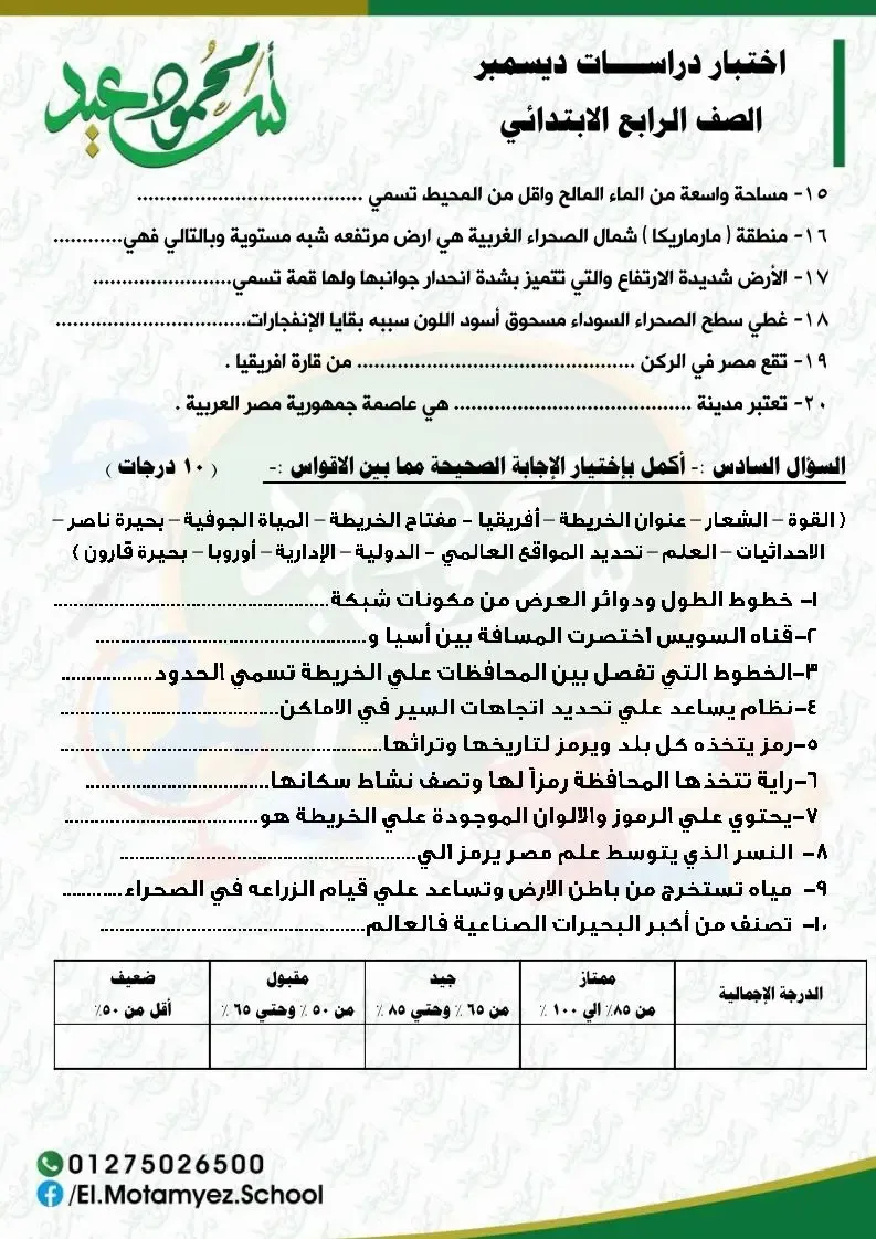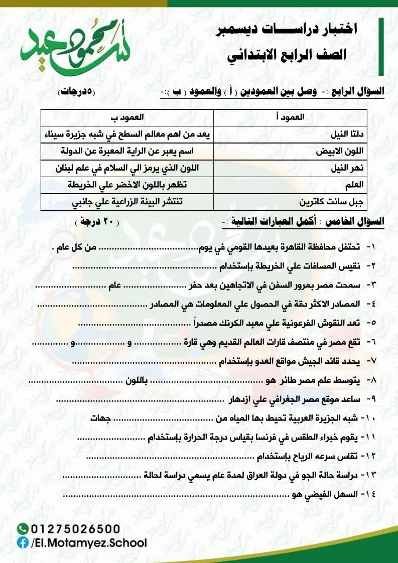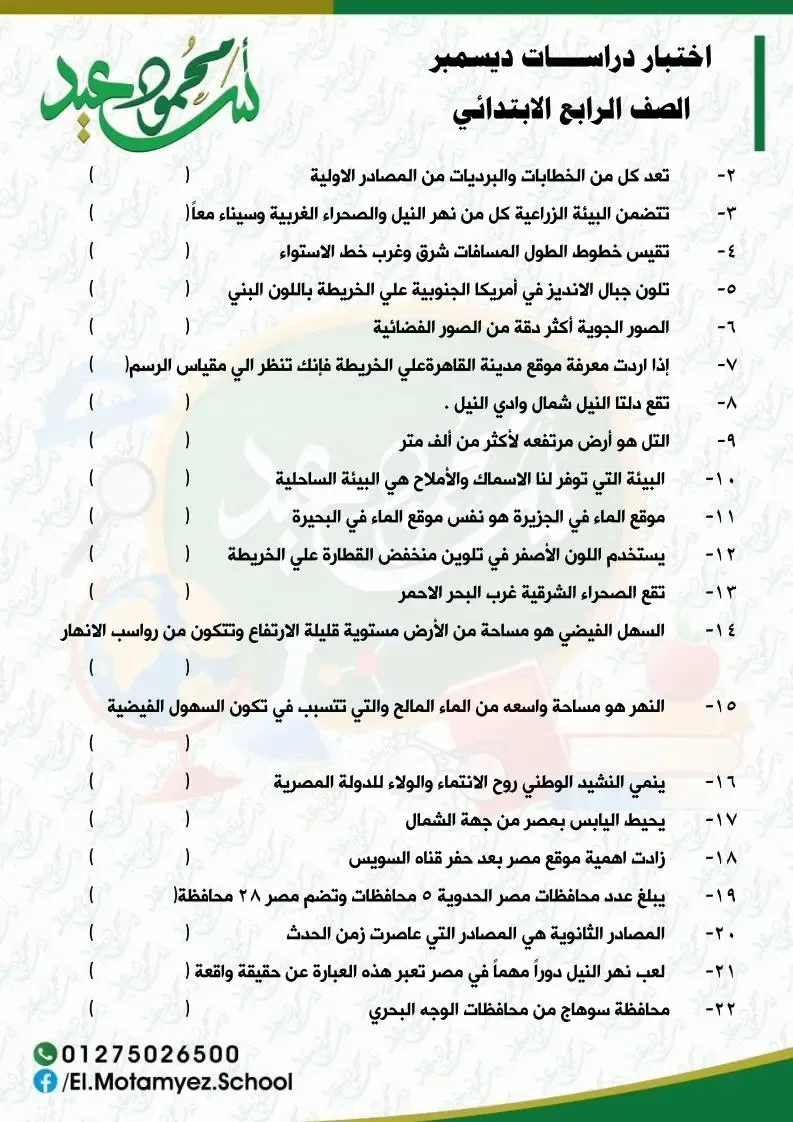 مجموعة أسئلة و إختبارات فى مادة الدراسات الإجتماعية للصف الرابع الابتدائي الفصل الدراسى الأول