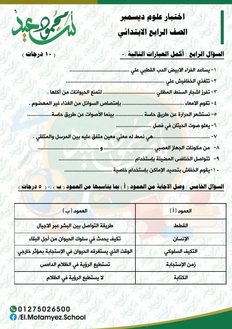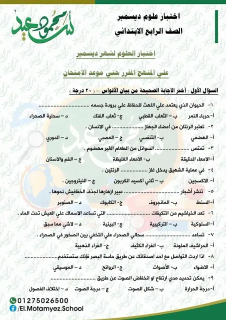 مجموعة أسئلة و إختبارات فى مادة العلوم للصف الرابع الابتدائي الفصل الدراسى الأول.