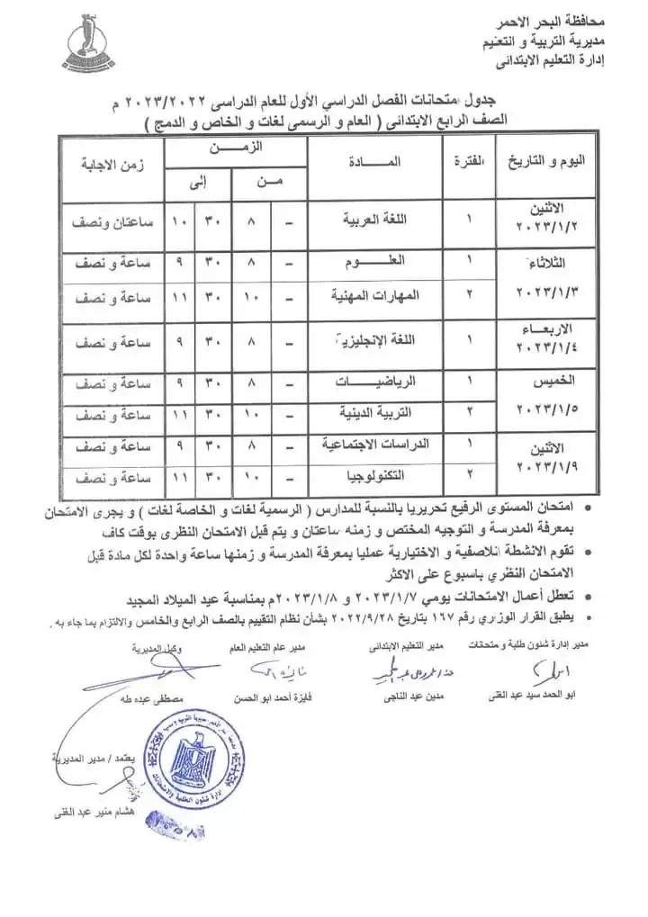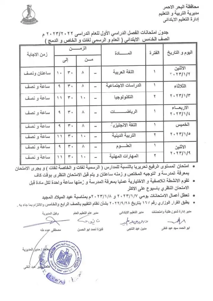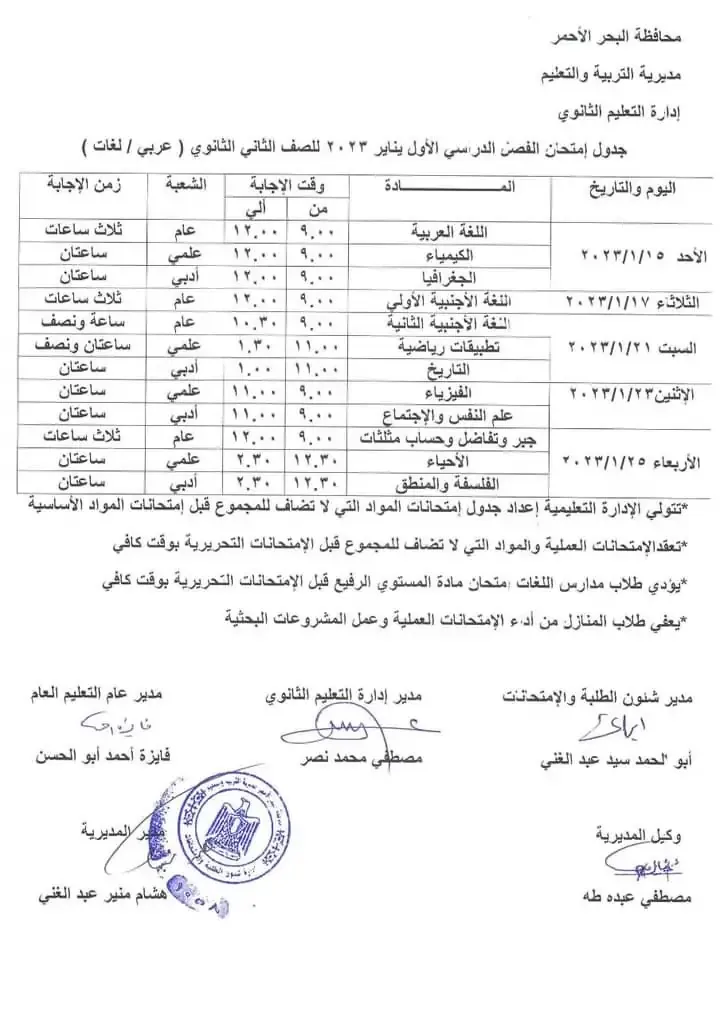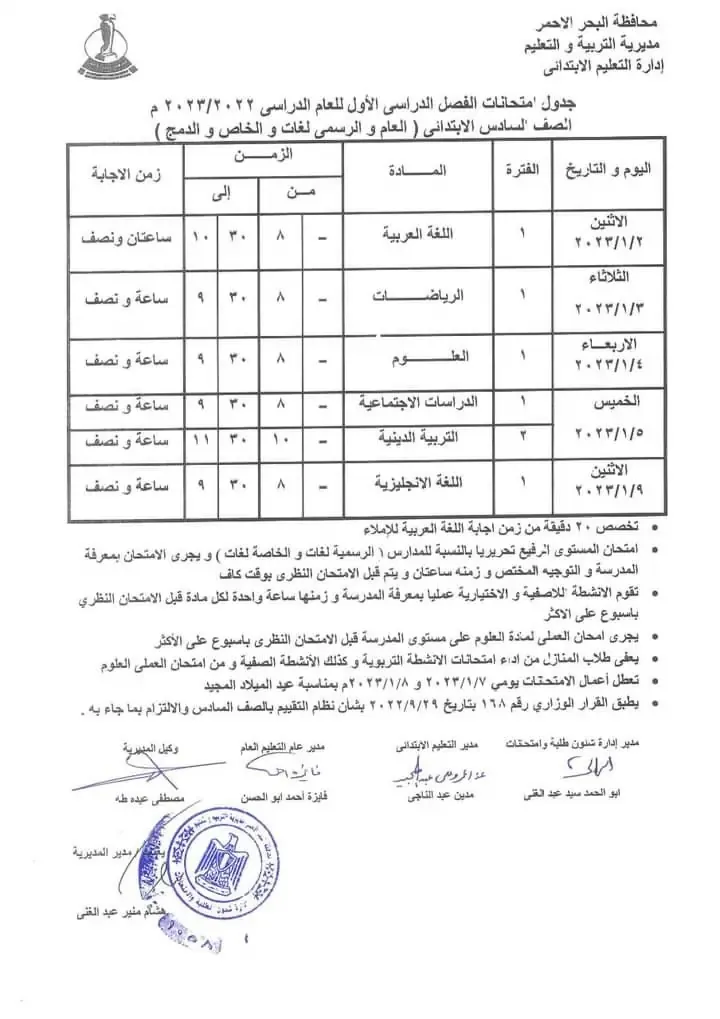 يهتم العديد من طلاب صفوف الابتدائي والإعدادي والثانوي بالمراحل الدراسية المختلفة في محافظة البحر الأحمر بالتعرف على جداول امتحانات الترم الاول للعام الدراسي 2022 - 2023.